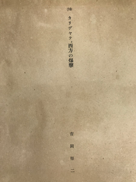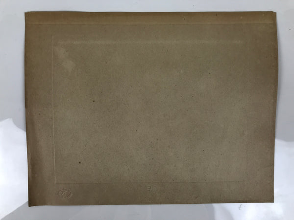 This is a vintage Japanese machine-printed reproduction of military art by Kenji Yoshioka. The piece is called 'Bombing of South Kalijati' (1942). The piece is placed on a piece of cardboard with a protective sheet of paper on top, with explanations in Japanese.