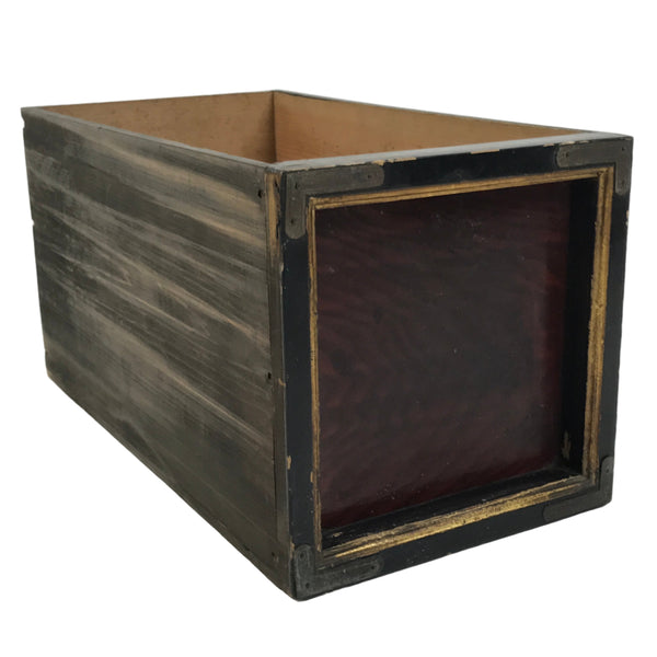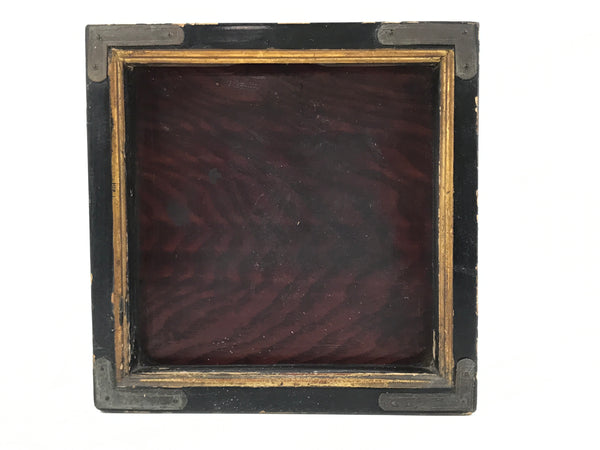 This item comes from an antique Japanese wooden Buddhist altar cabinet. This drawer is mostly coated in brown lacquer; the sides are matte, but the wooden grain can be seen through, and the front is glossy, though it is worn.  The square front has a black frame with a drawer pull on the inside of the frame top. The black frame has gold embellishment and metal parts on the corners.
