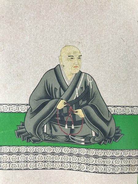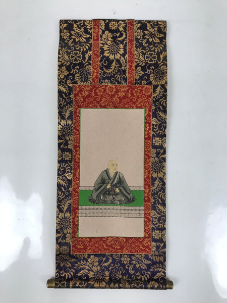 This Japanese vintage paper hanging scroll (kakejiku) features an image of Rennyo, a Buddhist monk head of the Honganji temple of the Jodo Shinshu sect. It is a side scroll, or wakigake, part of a pair of scrolls to be displayed on each side of a central scroll or a statue. It is a powerful religious image, aimed to be at the center of an altar. This kakejiku is dark blue and red with a gold floral pattern. The image is black, gray, green, and red.