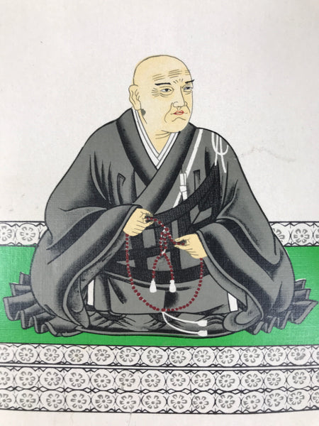 This Japanese vintage paper hanging scroll (kakejiku) features an image of Rennyo, a Buddhist monk head of the Honganji temple of the Jodo Shinshu sect. It is a side scroll, or wakigake, part of a pair of scrolls to be displayed on each side of a central scroll or a statue. It is a powerful religious image, aimed to be at the center of an altar. This kakejiku is dark blue and red with a gold floral pattern. The image is black, gray, green, and red.