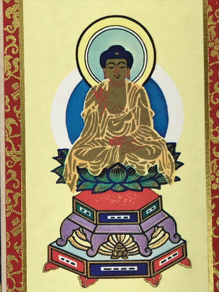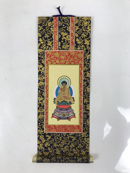This Japanese vintage paper hanging scroll (kakejiku) features an image of the Buddha, Shaka Nyorai in Japanese. It is a central scroll, or gohonzon, a powerful religious image, aimed to be at the center of an altar. This kakejiku is for the Soto and Rinzai schools, two Zen Buddhist schools. It is dark blue and red with a gold floral pattern. The image is yellow, brown, blue, green, red, and purple.