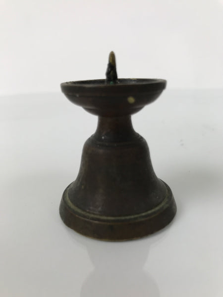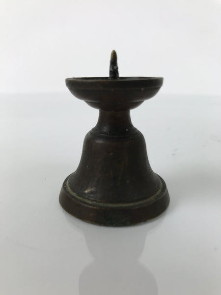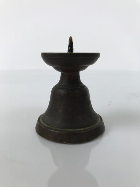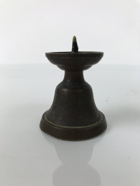 This item is a Japanese vintage Buddhist altar candle holder stand. This small brass metal candlestick is brown (patina) and has a very simple, classic design with a bell-like base. Candlestands or candlesticks are basic Buddhist tools used in most sects and an essential for Buddhist altars (Butsudan).