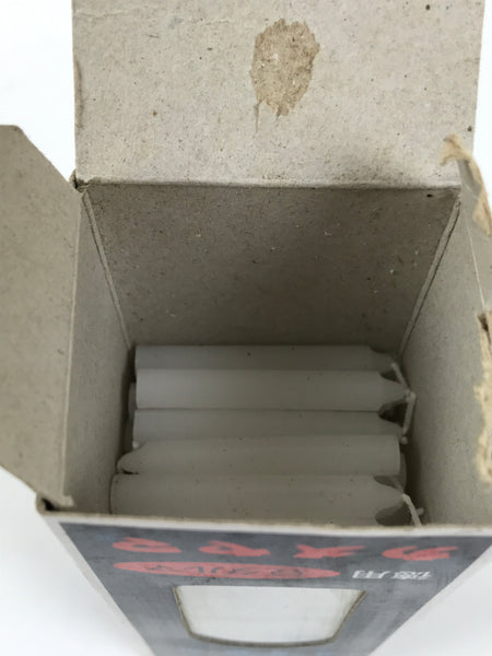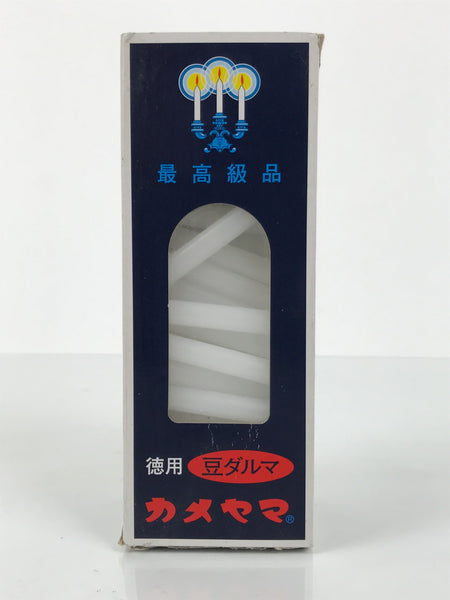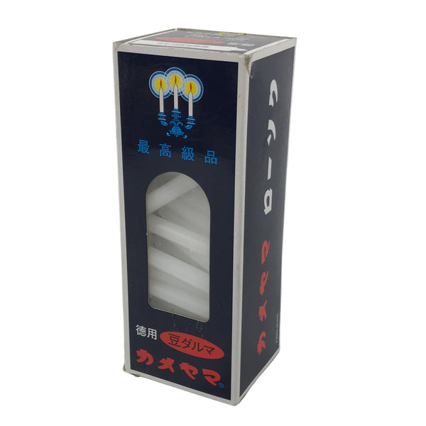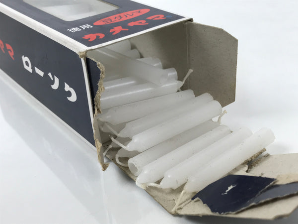 This is a vintage Japanese set of eighty-one candles for Buddhist altars (butsugu).  Candles are set on candlestands or candlesticks and lit in Buddhist altars, which is an essential for most sects.  This set is cased in a paper box. According to the box, the candles burn for nineteen minutes. The candle manufacturer Kameyama is famous for the high quality of its products.