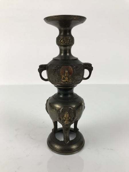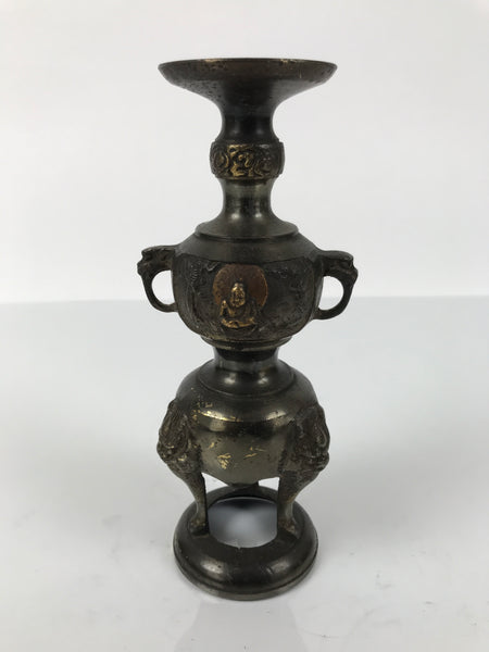 This item is a Japanese vintage Buddhist altar candle holder stand. This bronze metal candlestick is brown and has three legs with a Shishi motif, as well as two handles with an elephant motif. In the middle, it has a relief of Buddha with a halo on both sides. This candle stand doesn't have a spike to hold a candle. Candlestands or candlesticks are basic Buddhist tools used in most sects and are essential for Buddhist altars (Butsudan).