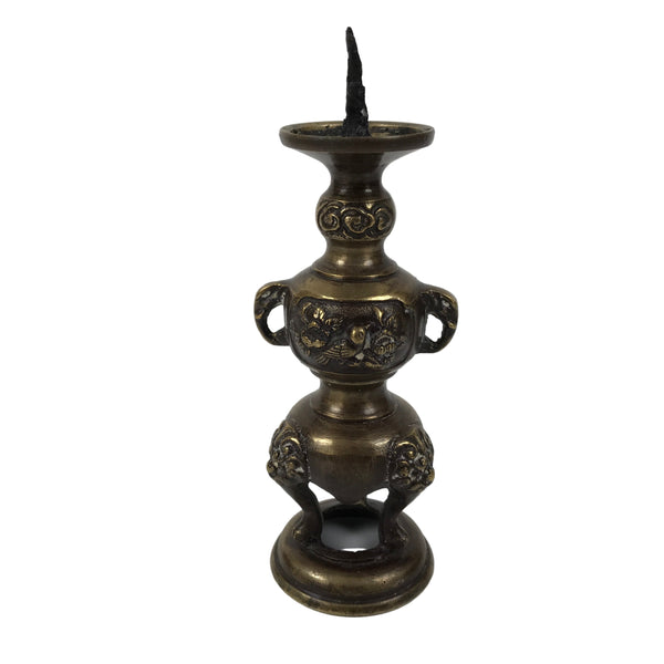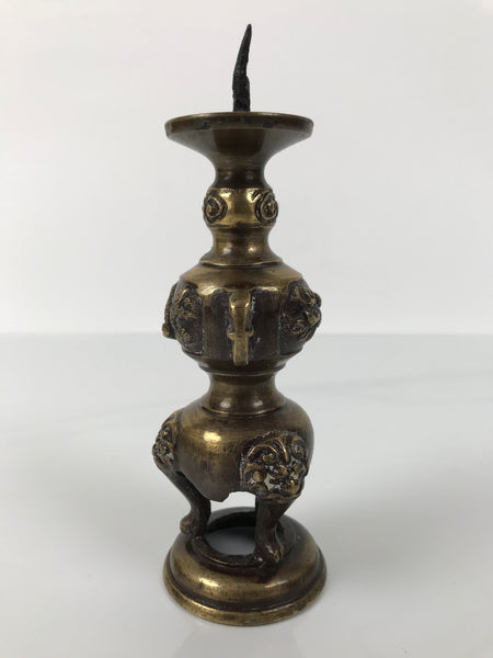 This item is a Japanese vintage Buddhist altar candle holder stand. This brass metal candlestick is gold and has three legs with a Shishi motif, as well as two handles with an elephant motif. In the middle, it features a relief of a bird with flowers on both sides. The spike to hold a candle is removable. Candlestands or candlesticks are basic Buddhist tools used in most sects and are essential for Buddhist altars (Butsudan).