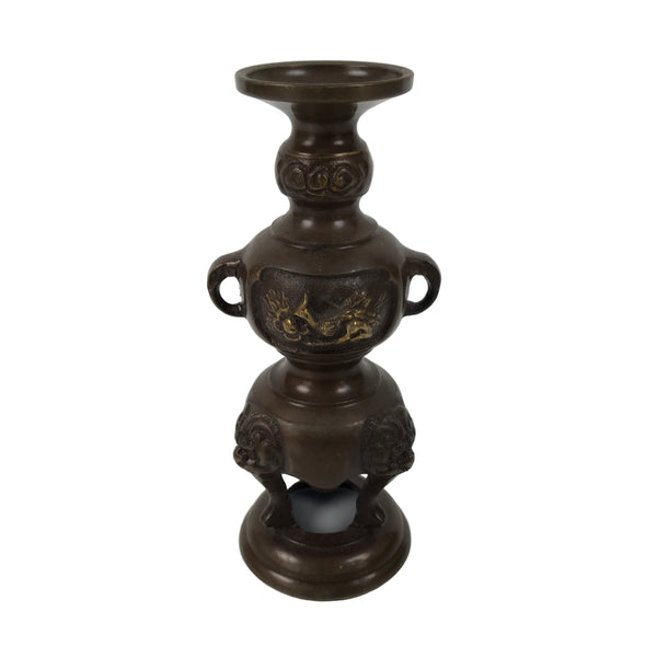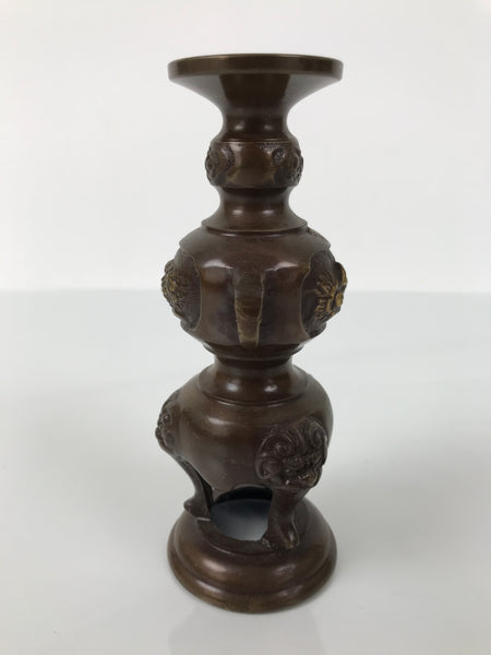 This item is a Japanese vintage Buddhist altar candle holder stand. This metal candlestick is brown and has three legs with a Shishi motif, as well as two handles with an elephant motif. In the middle, it has a relief of the Ho-oh bird on both sides. This candle stand doesn't have a spike to hold a candle. Candlestands or candlesticks are basic Buddhist tools used in most sects and are essential for Buddhist altars (Butsudan).