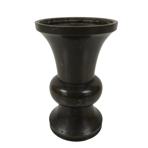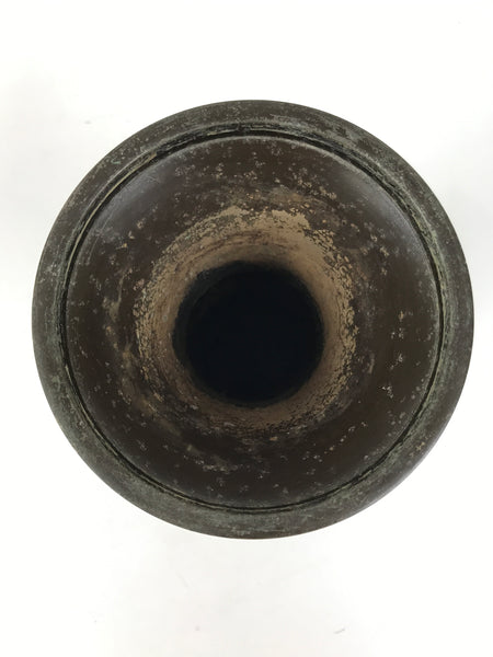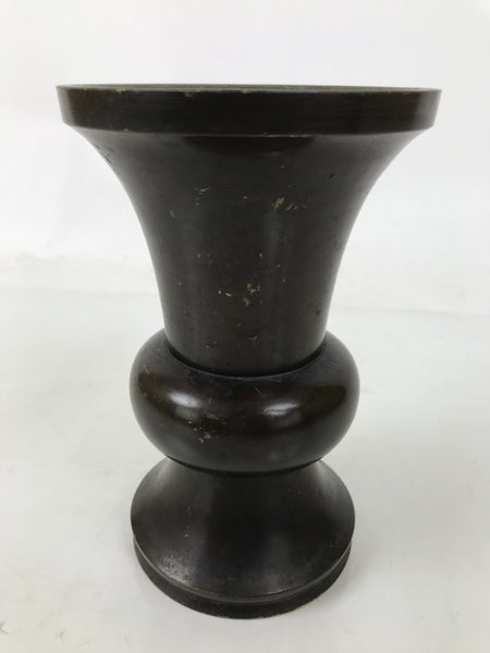 This is a vintage Japanese metal flower vase, or hanatate, for Buddhist altars. It is common to offer a range of seasonal and symbolic flowers in front of a Buddhist altar. It is also a vessel for Sakaki leaves or Shashagi leaves in Shinto. The offering of Sakaki tree leaves signifies that the gods living in the sakaki tree will protect the grave and the soul.