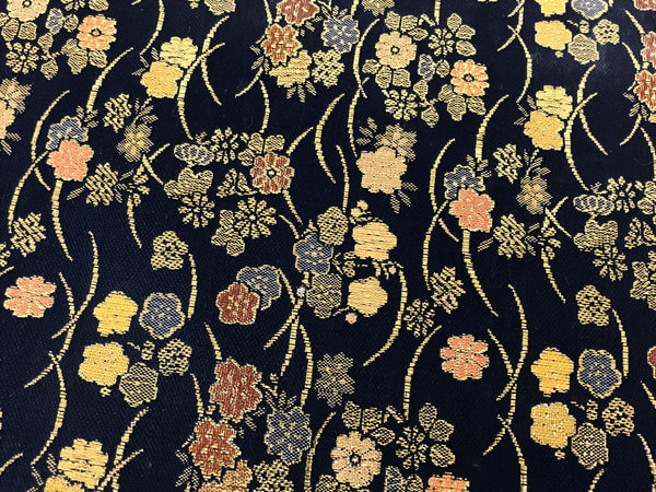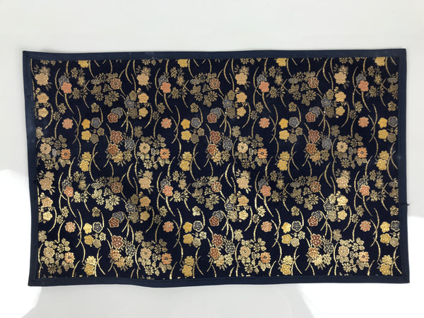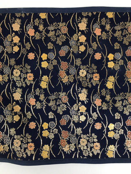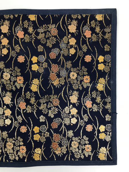 This is a vintage Japanese Buddhist altar tablecloth or uchishiki. Made of thin layers of woven silk stretched on thick washi paper, the back is plain white while the front side is a stunning navy blue color with gold, pink, yellow, and orange chrysanthemums and cherry blossoms. This tablecloth is rectangular and is made to sit on top of the kyozukue surface.