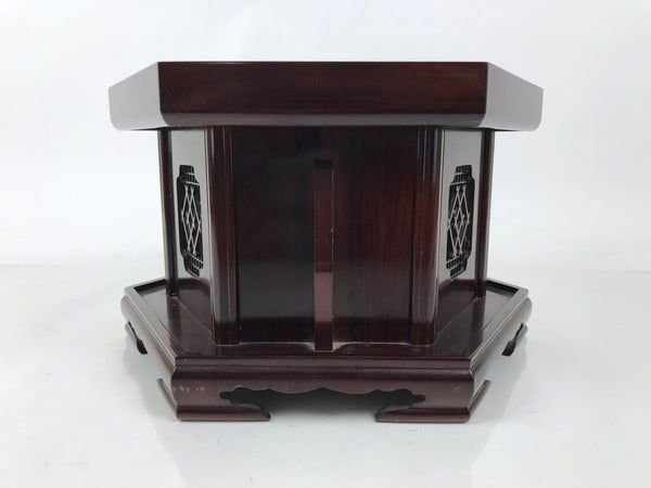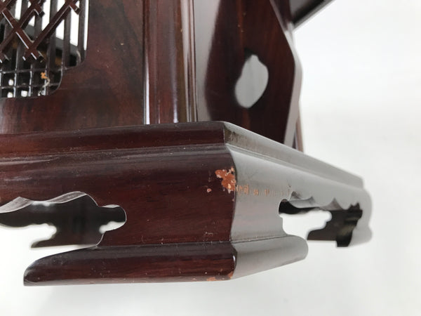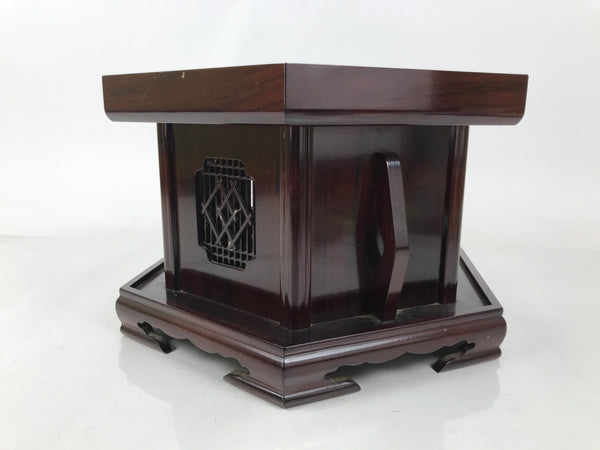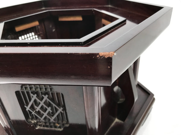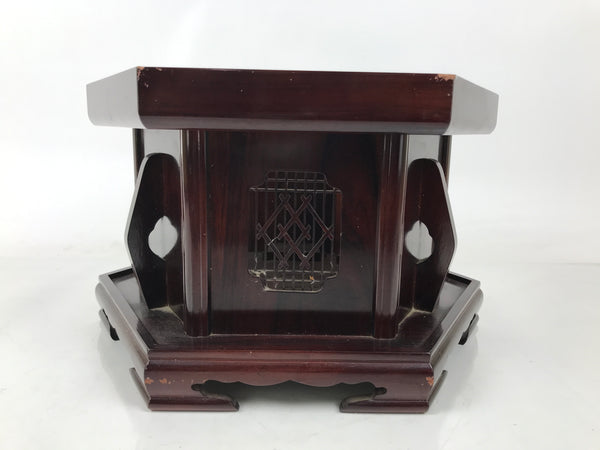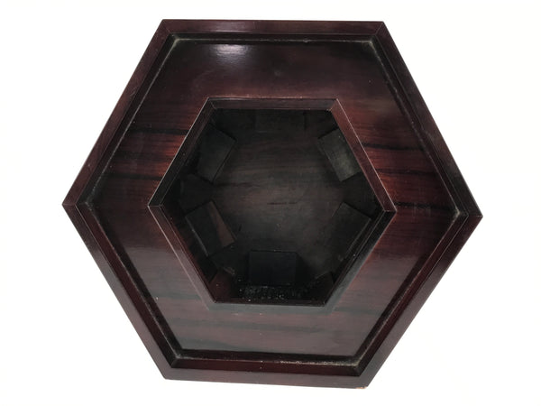 This is a vintage Japanese singing bowl stand made of composite wood with a slatted diamond design on three sides. This hexagonal-shaped dark brown stand can fit a large size orin bell commonly found in temples for service and ceremonies, and also used during funerals. Usually, the large bell rests on a silk cushion and is rung by using a large striker.