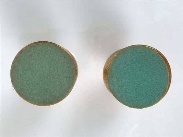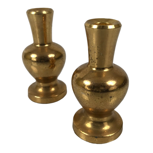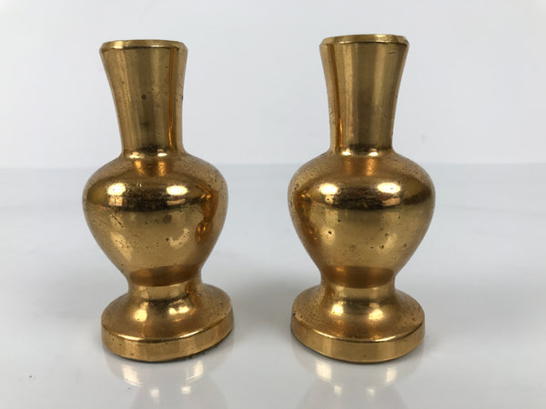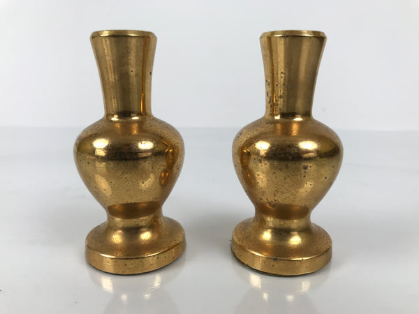 This is a pair of vintage metal flower vases, hanatate, for Buddhist altars. These particular vases are very simple in design with no added embellishments. They can hold individual or very small collections of flowers. There are light blue felt pads on the bottom of each to help prevent scratching surfaces.