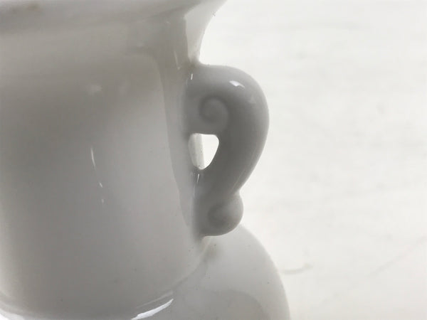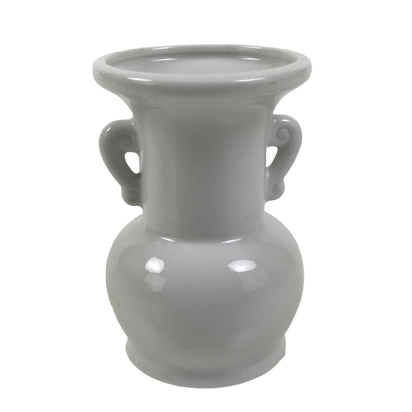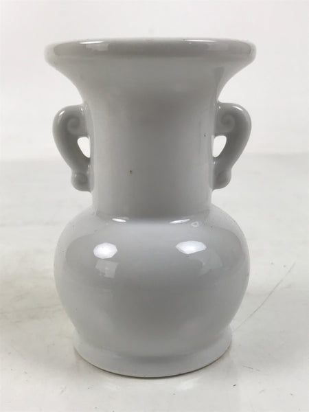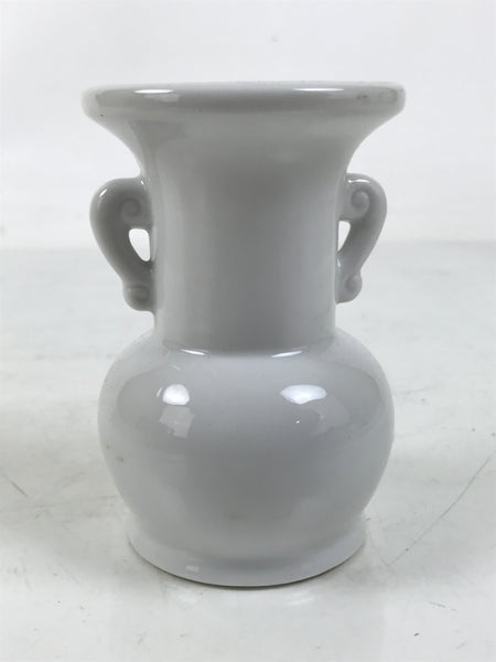 This is a porcelain flower vase, hanatate, for Buddhist altars. This particular vase is has a classic shape with decorative handles. It features a simple white glaze. It is common to offer a range of seasonal and symbolic flowers in front of a Buddhist altar. It is also a vessel for Sakaki leaves or Shashagi leaves in Shinto. The meaning of offering sakaki tree leaves is that the gods living in the sakaki tree will protect the grave and the soul.