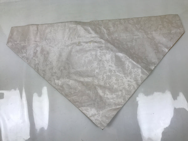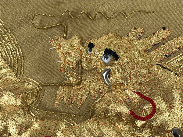 This is a vintage Japanese Buddhist altar tablecloth or uchishiki. Made of silk, the backside and the top border are white with a subtle dragon and cloud pattern, while the front side is gold with a grand gold embroidered dragon with resin eyes and claws.