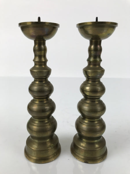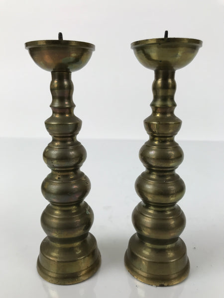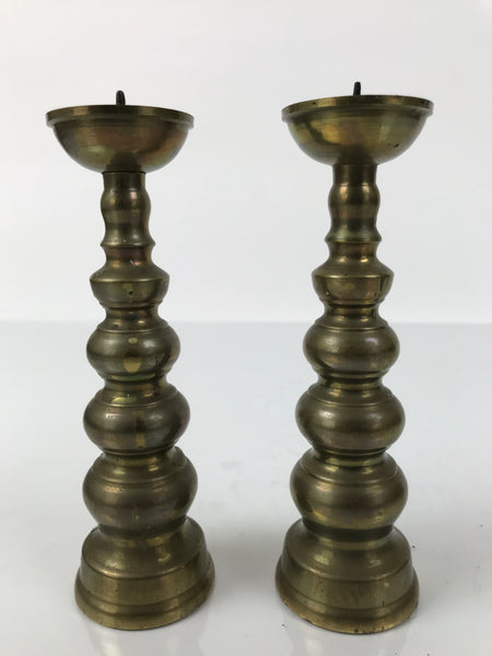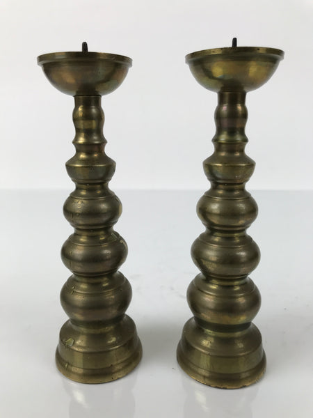 This is a pair of Japanese vintage Buddhist altar candle holder stands. These candlesticks are brass with a gold color and have a classic shape. Candlestands or candlesticks are basic Buddhist tools used in most sects and are an essential item for Buddhist altars (Butsudan).