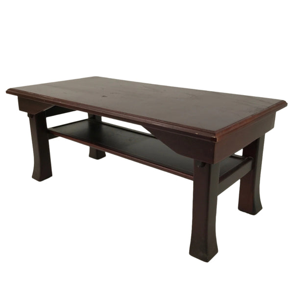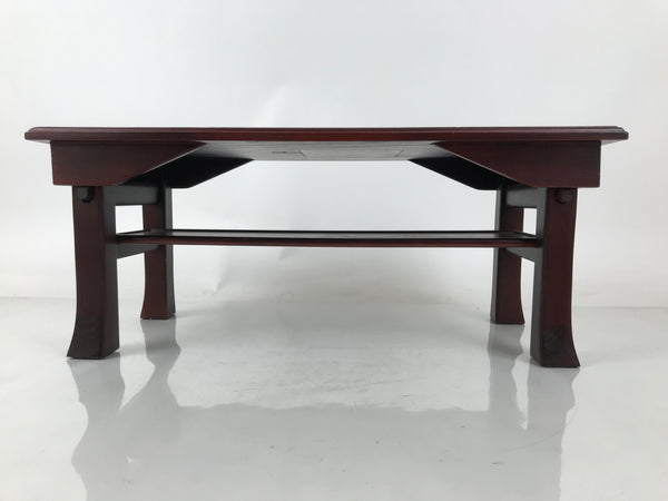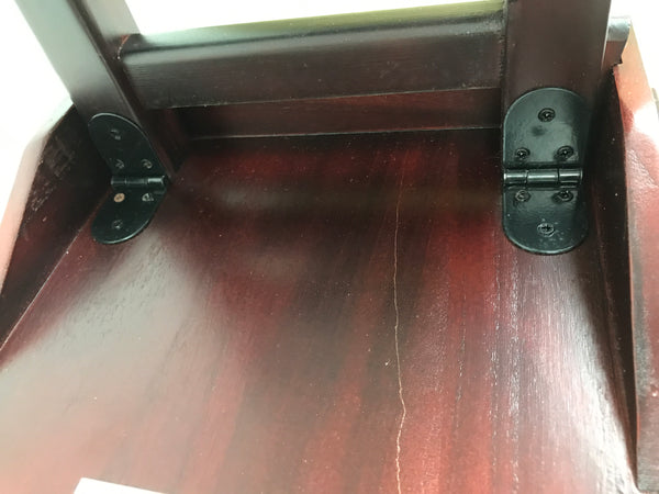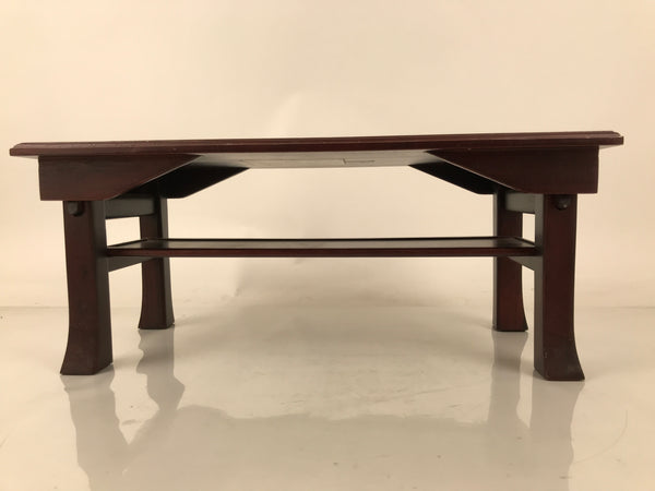 Dark brown with a brushed clear lacquer finish, this vintage Japanese Buddhist kyozukue offering table with a modern shape is a stunning focal point in any home altar. This piece is foldable for storage or portability. There is a shelf that sits between the legs that hold it open. It has a very simple design that is excellent for more subtle home altar arrangements.