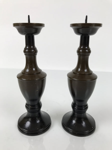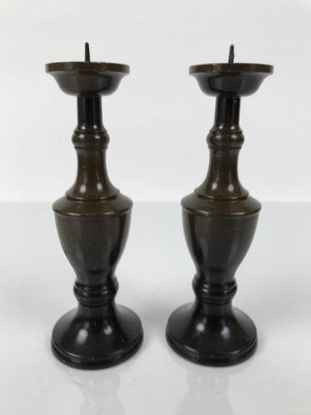 This is a pair of Japanese vintage Buddhist altar candle holder stands. These candlesticks are metal with a dark brown-to-black color and have a classic shape. Candlestands or candlesticks are basic Buddhist tools used in most sects and are an essential item for Buddhist altars (Butsudan).
