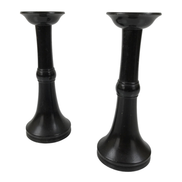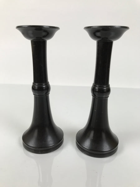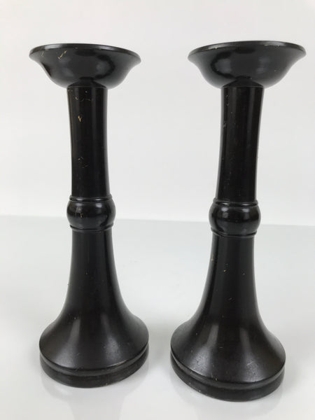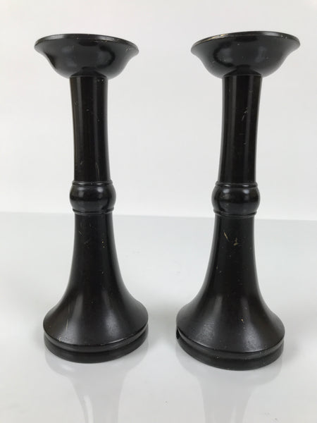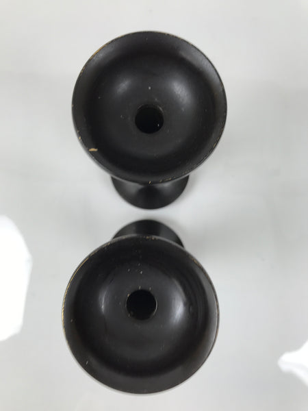 This is a pair of Japanese vintage Buddhist altar electric light candle holder stands. These candlesticks are metal with a dark brown color and have a classic shape. These candlesticks have a channel through the center that exits at the base for an electric wire (wire and light not included). Candlestands or candlesticks are basic Buddhist tools used in most sects and are an essential item for Buddhist altars (Butsudan).