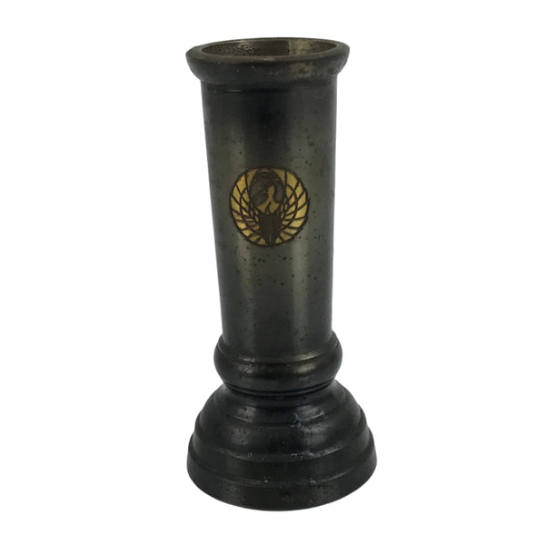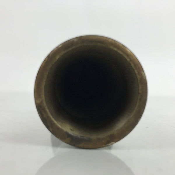 This is a metal incense stick holder, senkousashi, for Buddhist altars. It is used to hold long sticks of incense to be burned in front of a butsudan or Buddhist home altar during prayer. This particular container is brown and has a tube-like shape with a golden crane etched onto the front side. The golden crane is the Nichiren Shoshu sect mon symbol.