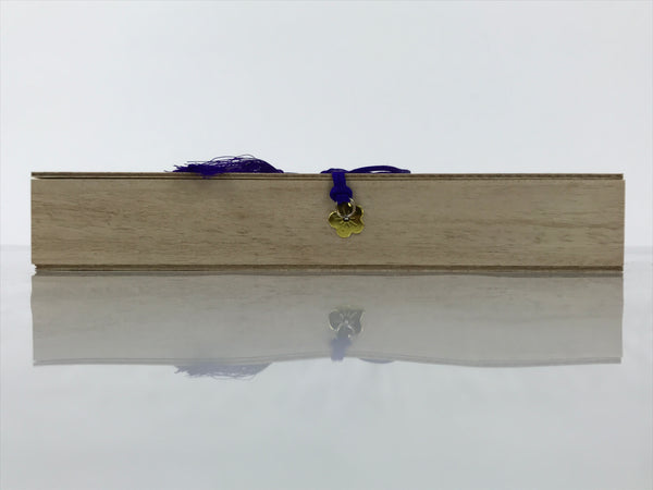 These are vintage Japanese Buddhist o-senko, incense sticks cased in a wooden box. It contains about four hundred and fifty-five sticks; seven bundles of incense sticks, and about sixty-five incense sticks in a bundle. Red paper bundling the sticks has a Japanese inscription. Purple string ties the wooden box and the lid, and the string is set with plum blossom-shaped metal parts on the box sides.