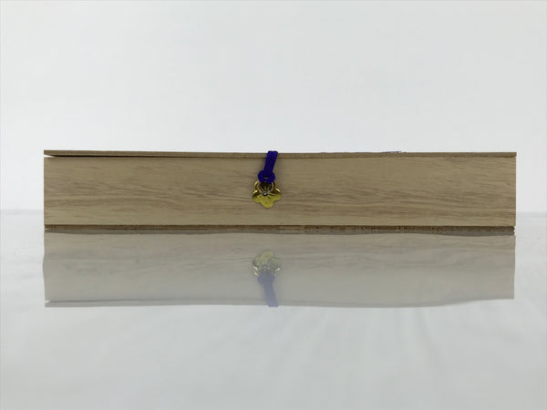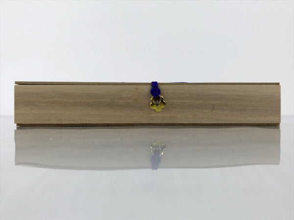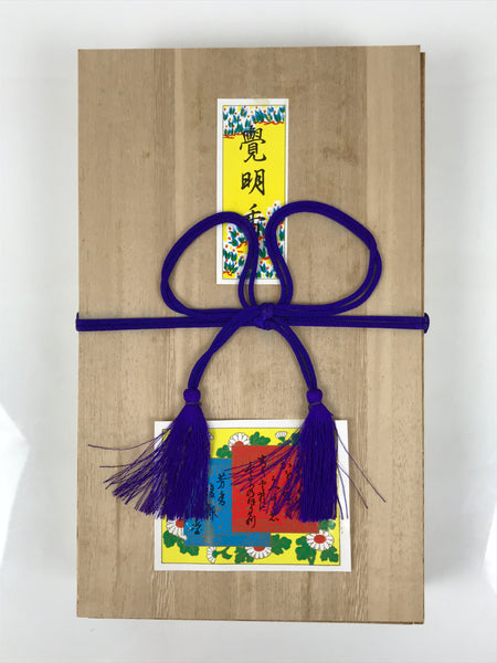 These are vintage Japanese Buddhist o-senko, incense sticks cased in a wooden box. It contains about four hundred and fifty-five sticks; seven bundles of incense sticks, and about sixty-five incense sticks in a bundle. Red paper bundling the sticks has a Japanese inscription. Purple string ties the wooden box and the lid, and the string is set with plum blossom-shaped metal parts on the box sides.