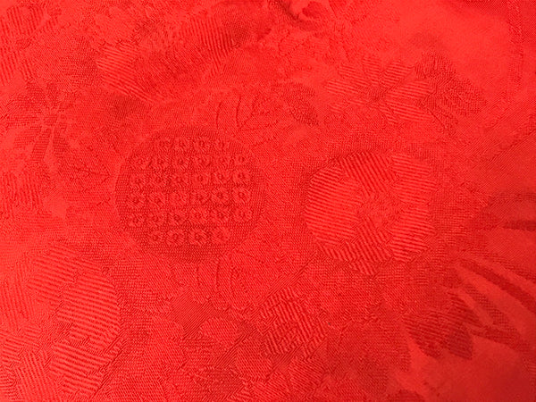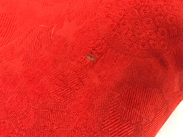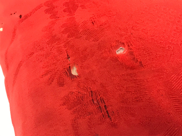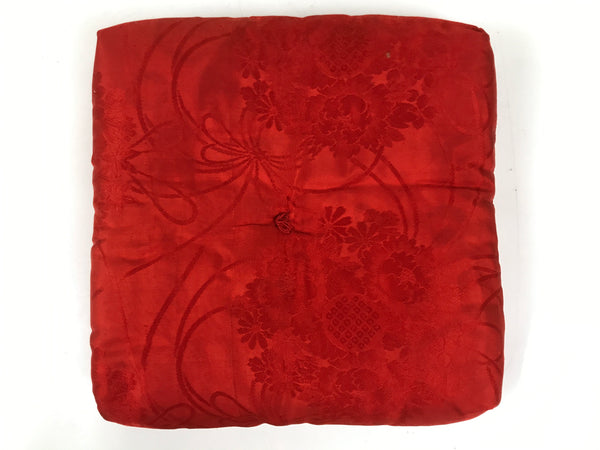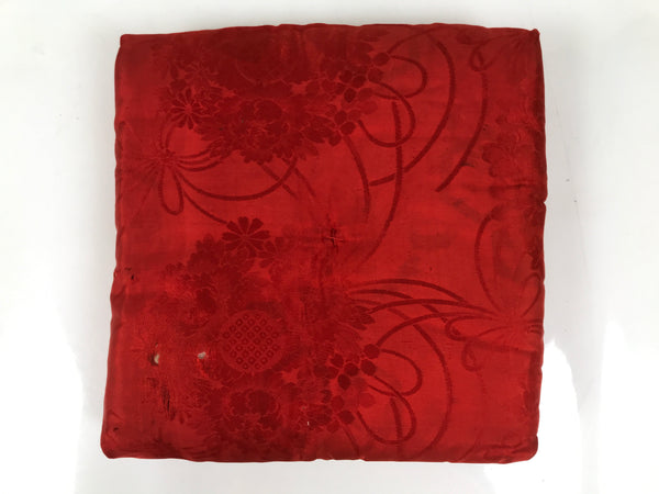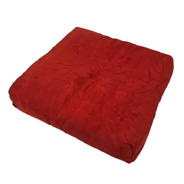 This is a vintage Japanese orin bell pillow or cushion for Buddhist altars. The cushion is made from a red silk fabric decorated with chrysanthemums and peonies. The piece is a square shape with no added decoration. This can be used for orin singing bells, but are also perfect for mokugyo (wooden frog) instruments.