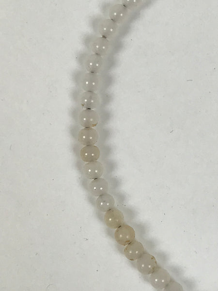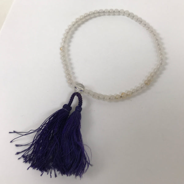This is a vintage Japanese Buddhist prayer rosary bracelet, Juzu. It is made of small, semi-opaque white glass beads. At the bottom is a large, clear glass bead, and there are purple tassels. This style is commonly used as a portable juzu for on-the-go and across various sects.