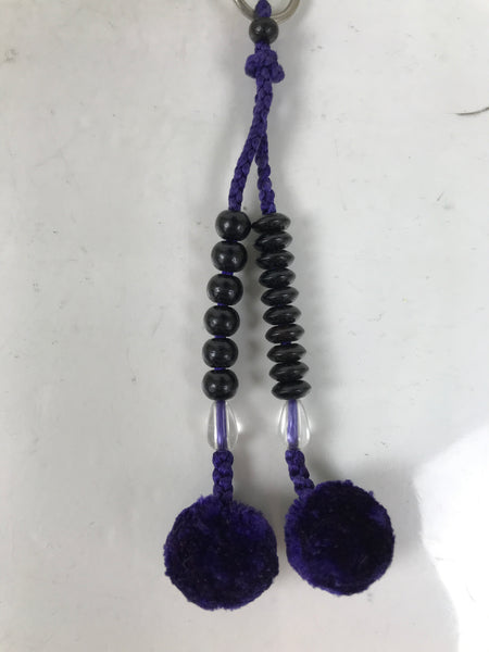 This is a pair of vintage Japanese Buddhist prayer rosary bracelets, Juzu. Two Juzu are connected, and one of them has ball-shaped purple tassels connected with metal rings. It is made of mall black, orange, and clear beads. A white string holds the whole chain.