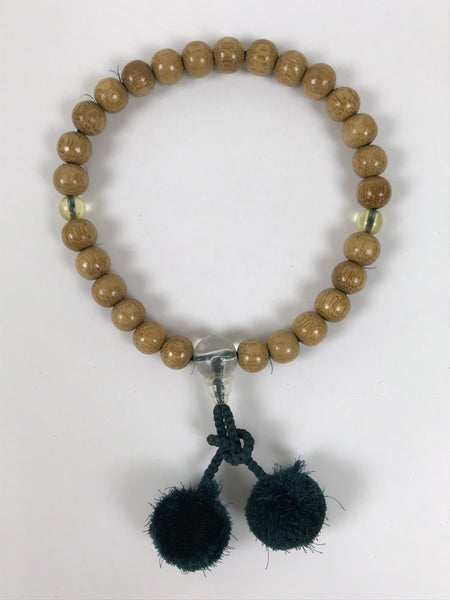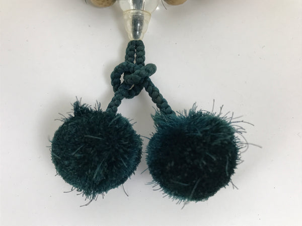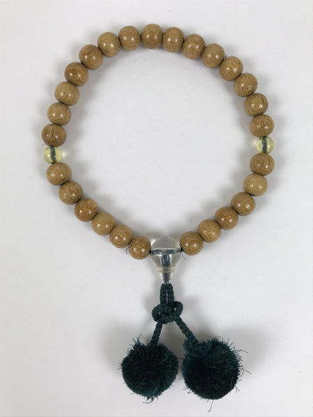 This is a vintage Japanese Buddhist prayer rosary bracelet, Juzu. It is made of brown and transparent beads. The whole chain is held together by a green string going through the transparent bead, which has green ball-shaped tassels. This style is commonly used as a portable juzu for on-the-go and across various sects.