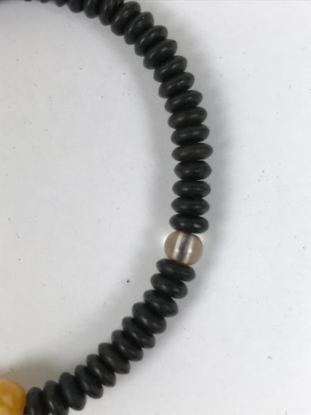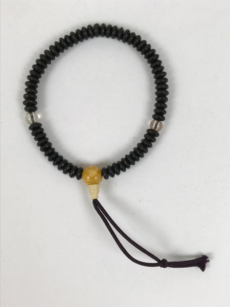 This is a vintage Japanese Buddhist prayer rosary bracelet, Juzu. It is made of black and transparent resin beads with a yellow larger bead. The whole chain is held by a purple string that goes through the yellow bead and makes a purple tassel. This style is commonly used as a portable juzu for on-the-go and across various sects.