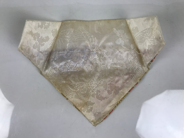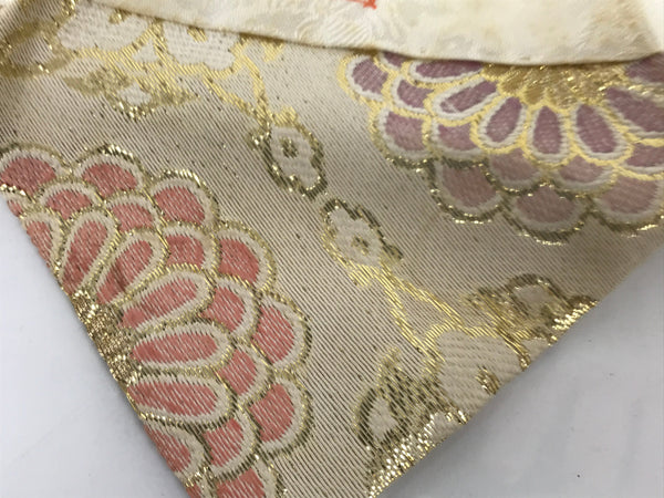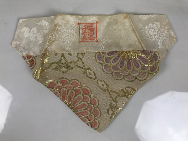 This is a vintage Japanese Buddhist altar tablecloth or uchishiki. Made of silk, the backside is white with a cloud and dragon pattern, while the front side is a very light beige/cream with large pink and purple chrysanthemums bordered with gold.