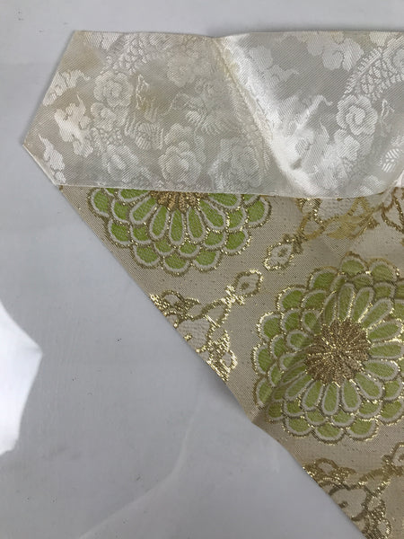 This is a vintage Japanese Buddhist altar tablecloth or uchishiki. Made of silk, the backside is white with a cloud and dragon pattern, while the front side is a very light beige/cream with large pink, green, yellow, and purple chrysanthemums bordered with gold.