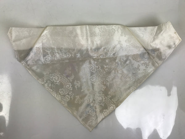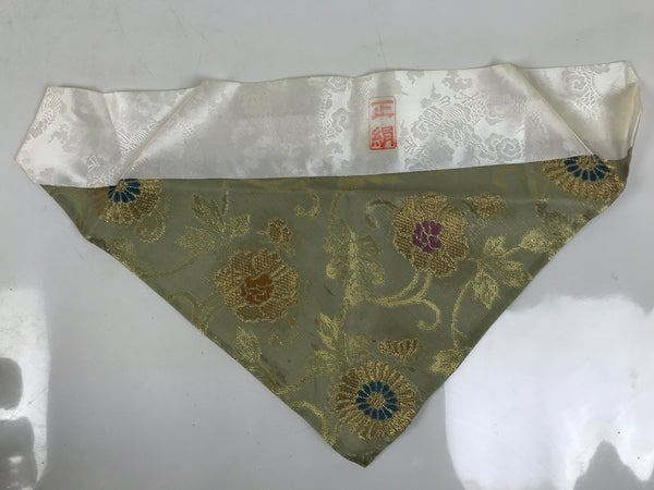 This is a vintage Japanese Buddhist altar tablecloth or uchishiki. Made of silk, the backside and the top border are white with a subtle dragon and cloud pattern, while the front side is an olive green with gold embroidered peonies (botan) and chrysanthemums (kiku).