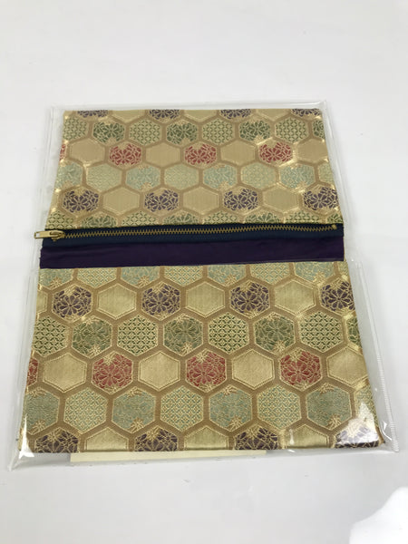 This Japanese vintage fabric prayer beads Juzu bag (Jyuzu-Bukuro) is used to carry rosary beads used in memorial services such as funerals, and/or Buddhist Sutra books. It is a gold color Nishiki Brocade bag woven with turtle shell patterns (kikkou). It has a purple lining and two pockets on the inside, one has a metallic fastener. This item comes in a paper box, and has a dedicated plastic cover.