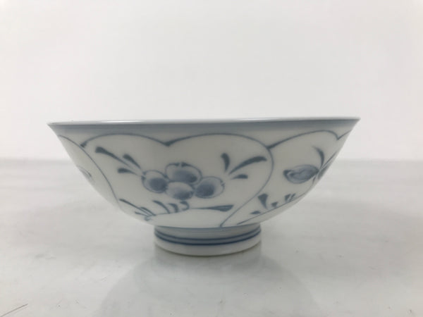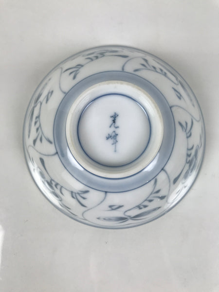 This item is a vintage Japanese Mino Ware porcelain rice bowl. This wide-mouthed small bowl is white with a blue design commonly known as "Shepard's Purse" that contains leaves, vines, and clusters of seeds. It can also be used for side dishes or as a chawan for drinking tea. Rice bowls are made to be lightweight and held in one hand (thumb on rim, other fingers on foot).