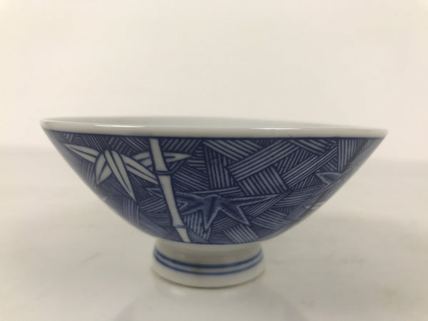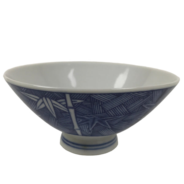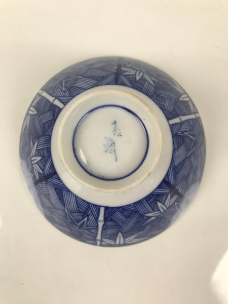 This item is a vintage Japanese porcelain rice bowl. The design on this wide-mouthed small bowl features a sometsuke white and blue design of stalks of bamboo in front of what appears to be a woven basket-like background. The foot of the bowl has two simple blue bands for decoration. It can also be used for side dishes. Rice bowls are made to be lightweight and held in one hand (thumb on rim, other fingers on foot).
