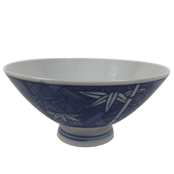 This item is a vintage Japanese porcelain rice bowl. The design on this wide-mouthed small bowl features a sometsuke white and blue design of stalks of bamboo in front of what appears to be a woven basket-like background. The foot of the bowl has two simple blue bands for decoration. It can also be used for side dishes. Rice bowls are made to be lightweight and held in one hand (thumb on rim, other fingers on foot).