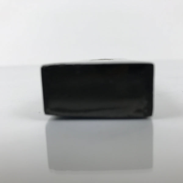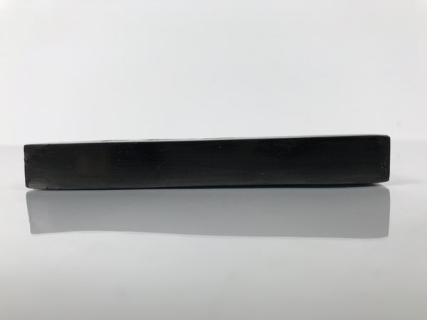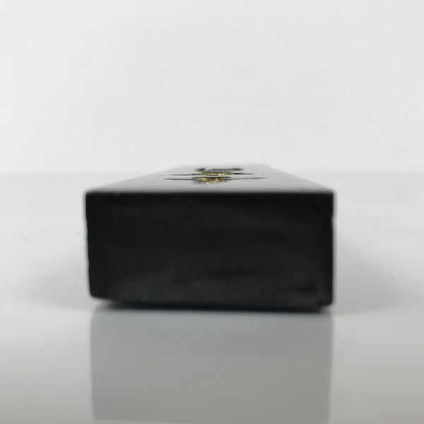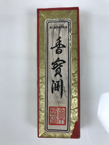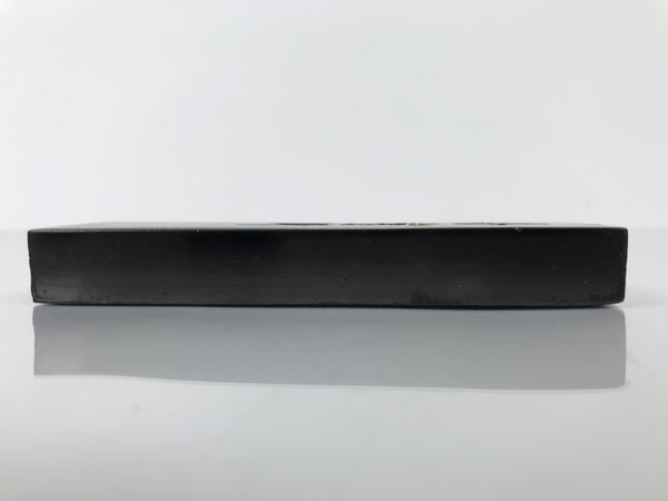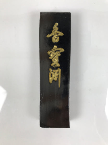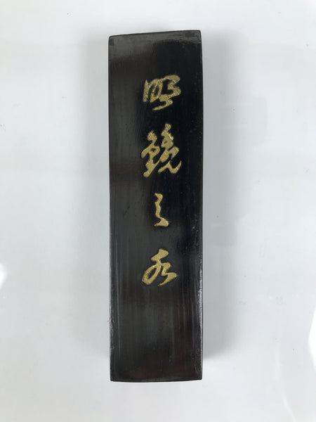 This is a Chinese vintage inkstick for calligraphy. It is black and has a gold inscription on both sides. To make ink, grind it with some drops of water on an inkstone. It is cased in the original paper box.