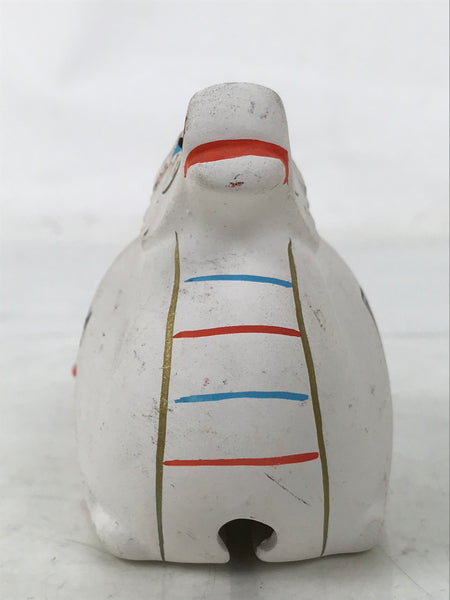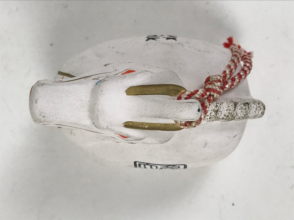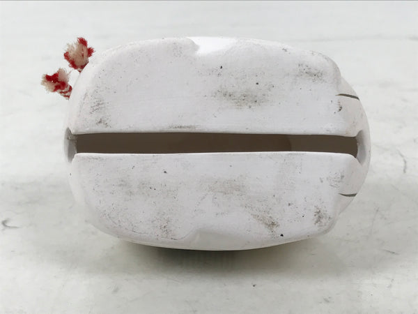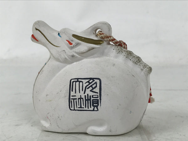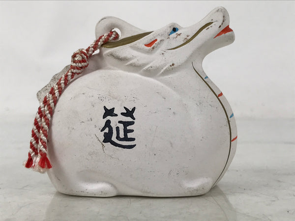 This is a vintage Japanese clay bell or dorei. Representing a dragon, this zodiac-themed dorei is white with red, blue, black and gold details, and features characters on the front and the back. It has a small white ball inside and a braided red and white string tied at the top.