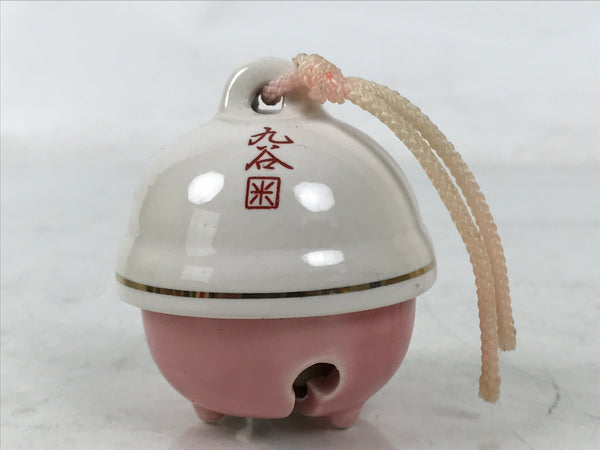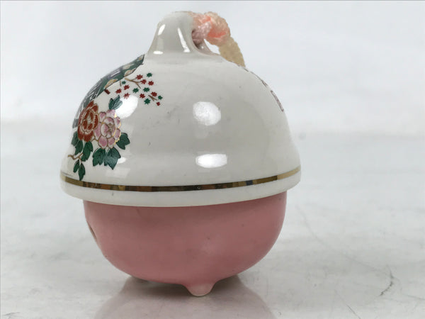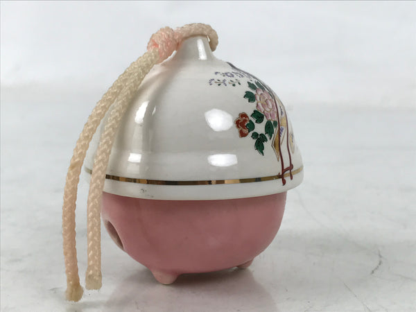 This is a vintage Japanese clay bell or dorei. Featuring a colorful illustration of an ox cart (goshoguruma in Japanese) with flowers and leaves. This dorei is pink on the bottom half and white on the top half. It features inscriptions on the back. It has a small clay ball inside and a braided light pink string tied at the top.
