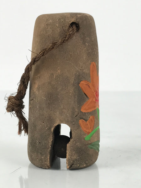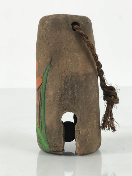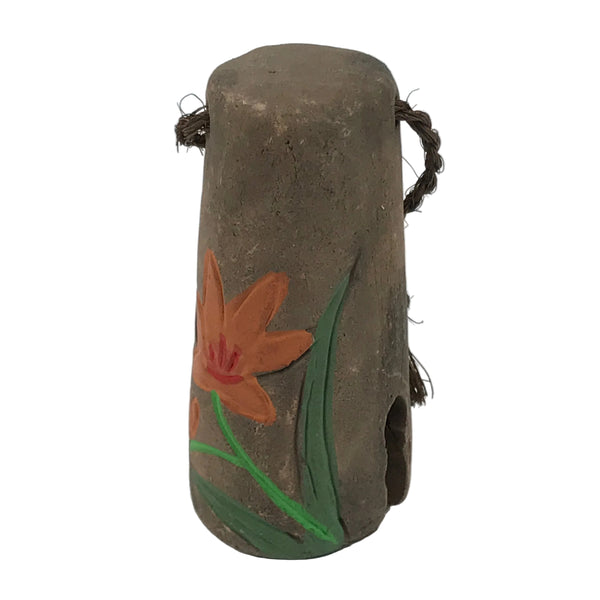 This is a vintage Japanese clay bell, Dorei or Tsuchi-Suzu. It is a brown cylindrical shape with orange tiger lilies (oniyuri) painted on the side with bright green leaves and stems. There is a twine string attached to the top, and there is a brown clay ball inside.