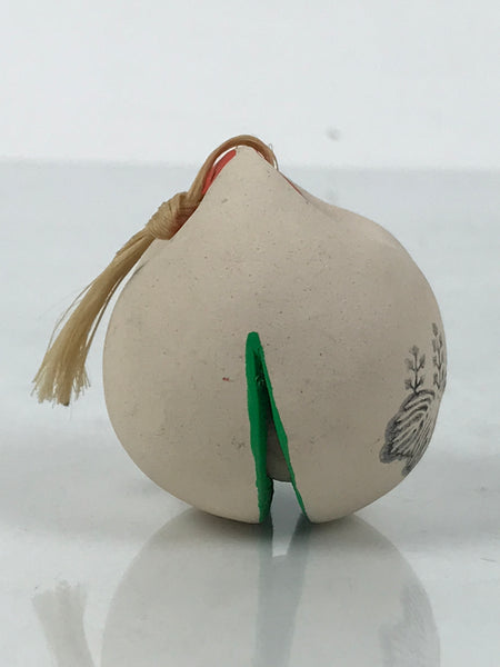 This is a vintage Japanese clay bell, Dorei or Tsuchi-Suzu, in a classic rounded shape. It is white with red and orange accents. On one side are stamped images of a paulownia flower and chrysanthemum, both important symbols of Japan. The other side has kanji writing that says "Koudaiji Temple". There is a twine string tied at the top via a loop.