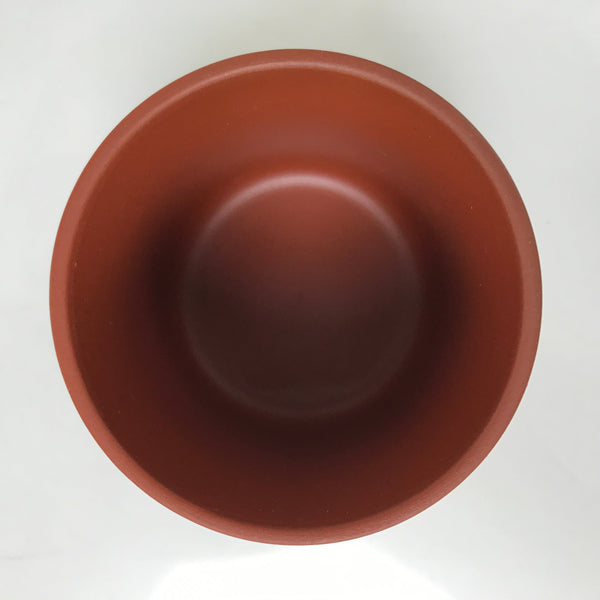 This is a vintage Japanese ceramic Tokoname ware teacup. Made of simple red clay, this pottery features a carved design of a bamboo stalk with leaves and a band around the middle. It is used for drinking sencha loose-leaf tea.