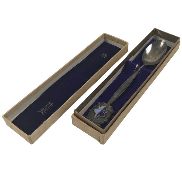 This is a vintage Japanese metal teaspoon cased in a paper box. The box has a thin wooden sheet surface and a purple lining with gold kanji. This spoon is silver in color. The handle is thin and features an emblem with blue enamel. It has a signature on the backside of the handle.