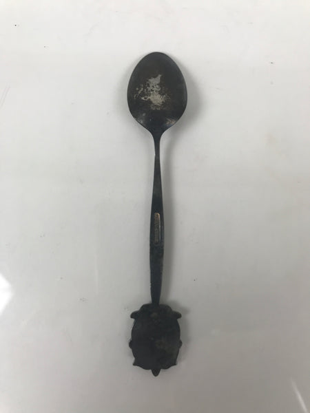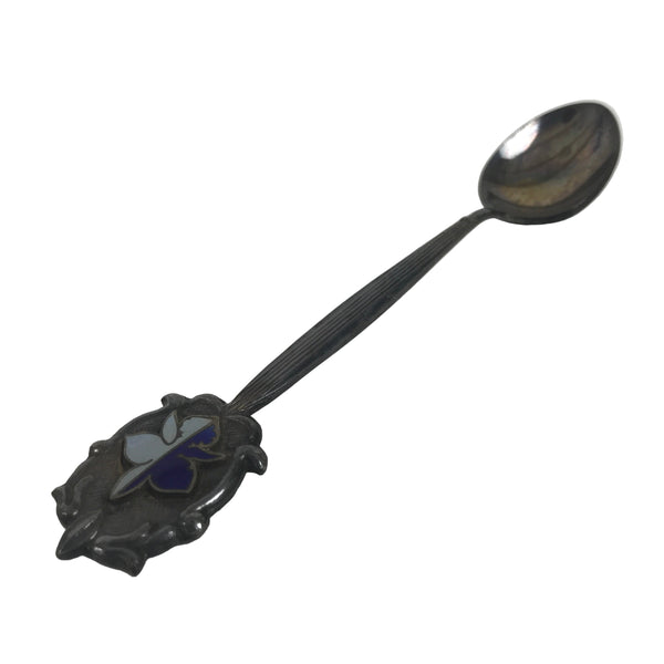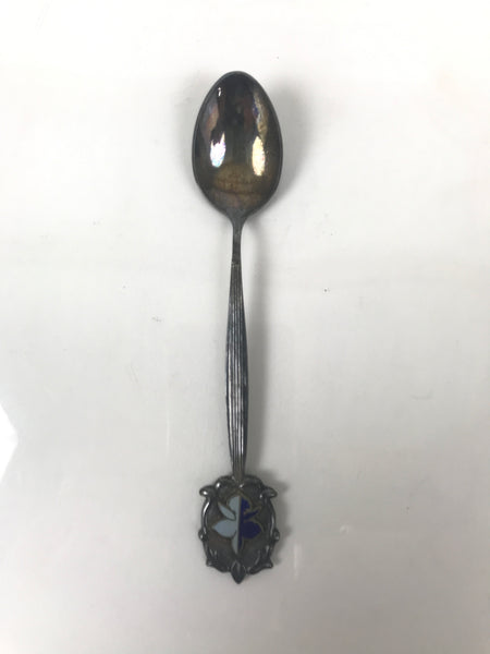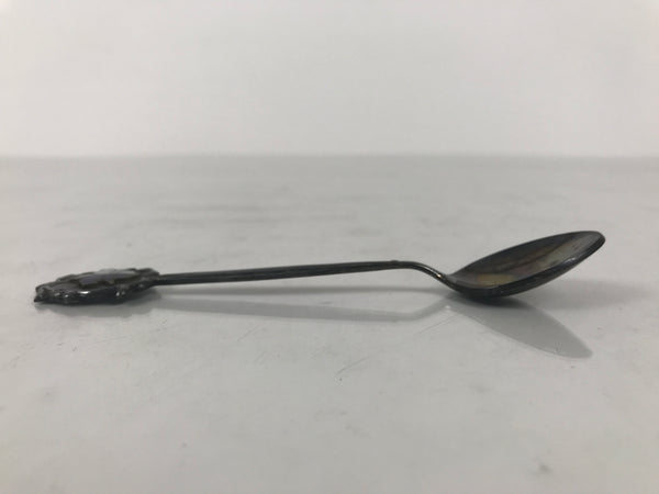 This is a Japanese vintage metal teaspoon. This spoon is silver in color. The handle is thin and features an emblem with blue enamel. It has a signature on the backside of the handle.