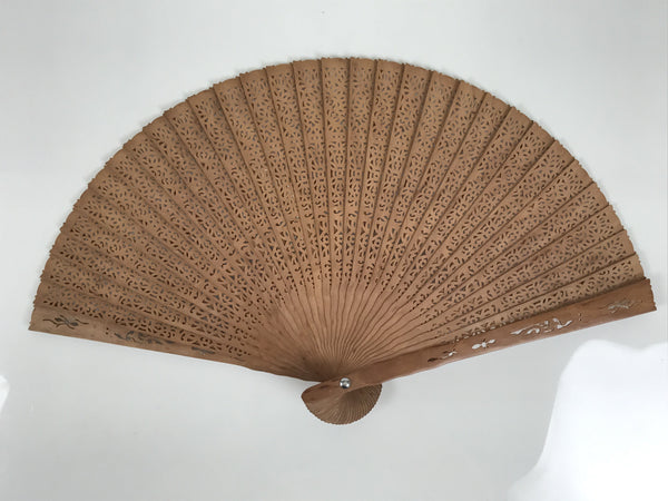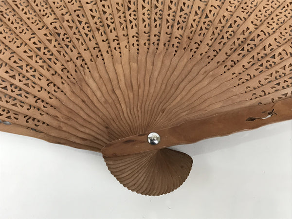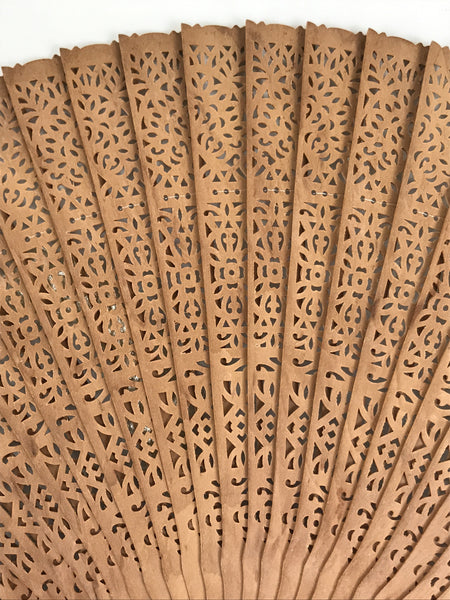 This is a traditional Chinese carved sandalwood fan. It has a round cutout floral design throughout. It is well-made and has a medium brown color. The pieces of this fan are attached with a strong clear plastic string, and at the very bottom is a metal loop with a white string with two tassels attached.