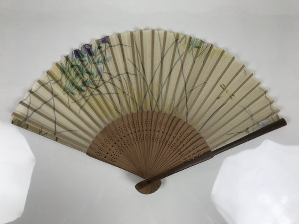 This is a traditional Japanese folding fan called sensu. You can use this when it's hot or as decoration. This decorative fan is made with a sheer fabric. The neutral-tone design features dragonflies among purple flowers. The frame is natural bamboo with decorative cutouts.