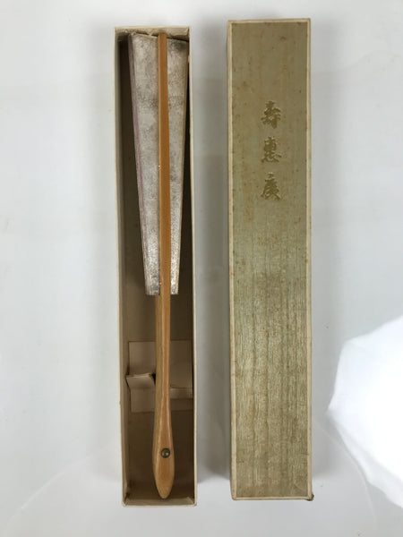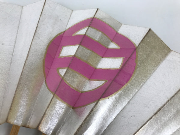 This is a traditional Japanese folding fan called sensu. You can use this when it's hot or as decoration. It is sometimes used in traditional Japanese dance. It is metallic gold foil paper on one side and silver on the other. Both sides have a round mon crest both in red and pink. The frame is natural bamboo. It comes stored in a paper box.