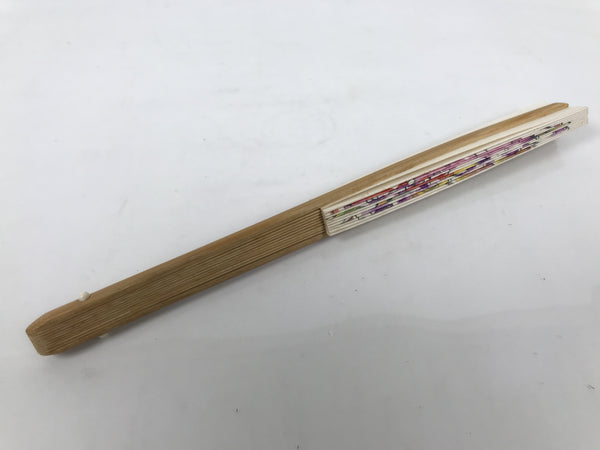 This is a traditional Japanese folding fan called sensu. You can use this when it's hot or as decoration. This decorative fan features an illustration of flowers drawn in a sketchbook-like style and painted in purple, red, yellow and green. The inner frame is natural bamboo. The back of the fan is white with inscriptions on the left.