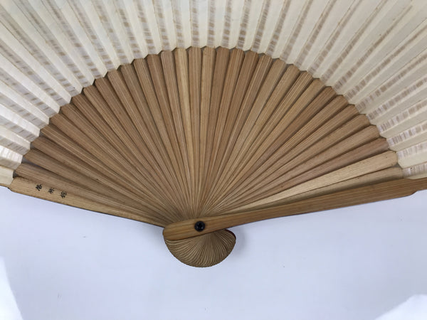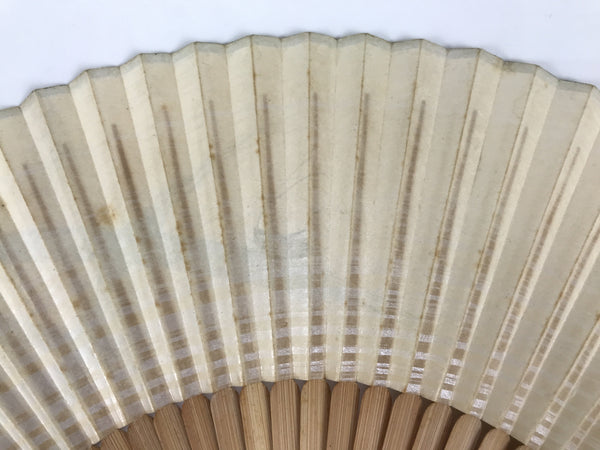 This is a traditional Japanese folding fan called sensu. You can use this when it's hot or as decoration. The front side of this paper fan is white with. navy blue border and features a silver cricket standing on a long green leaf or blade of grass. The back side is a beige color with a little shimmer. It is made with a natural bamboo frame with brown lacquered edges for an accent.