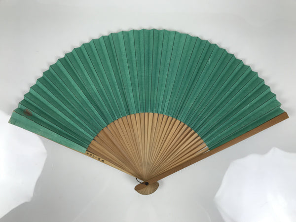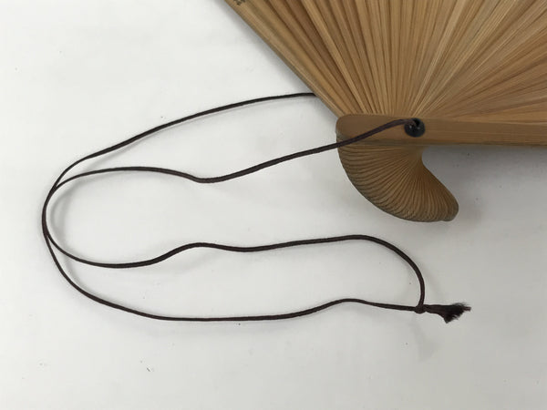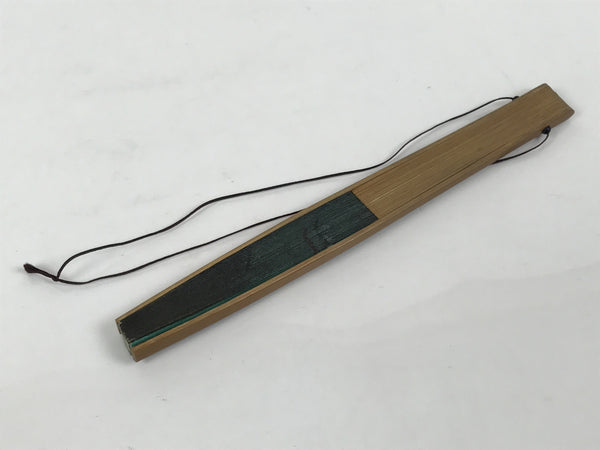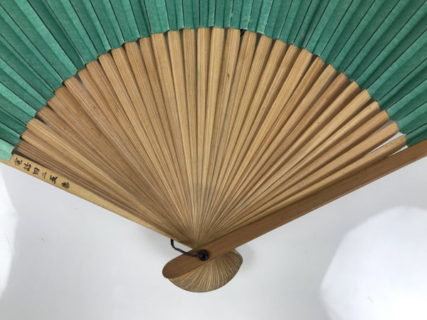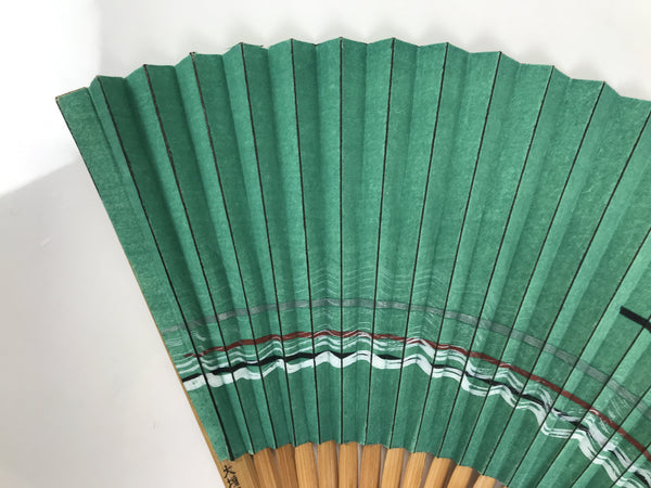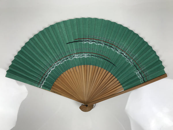 This is a traditional Japanese folding fan called sensu. You can use this when it's hot or as decoration. The front side of this paper fan is mostly a bold teal color that features a line design that consists of silver, red, black, and white lines. There is a dark brown string attached to the bottom.