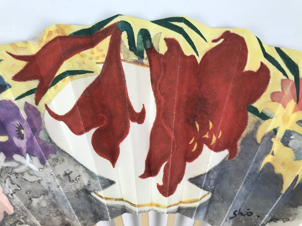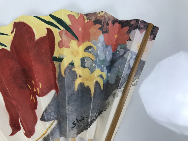 Japanese Paper Folding Fan Sensu Vtg Bamboo Frame Flowers Lilies Red 4D991